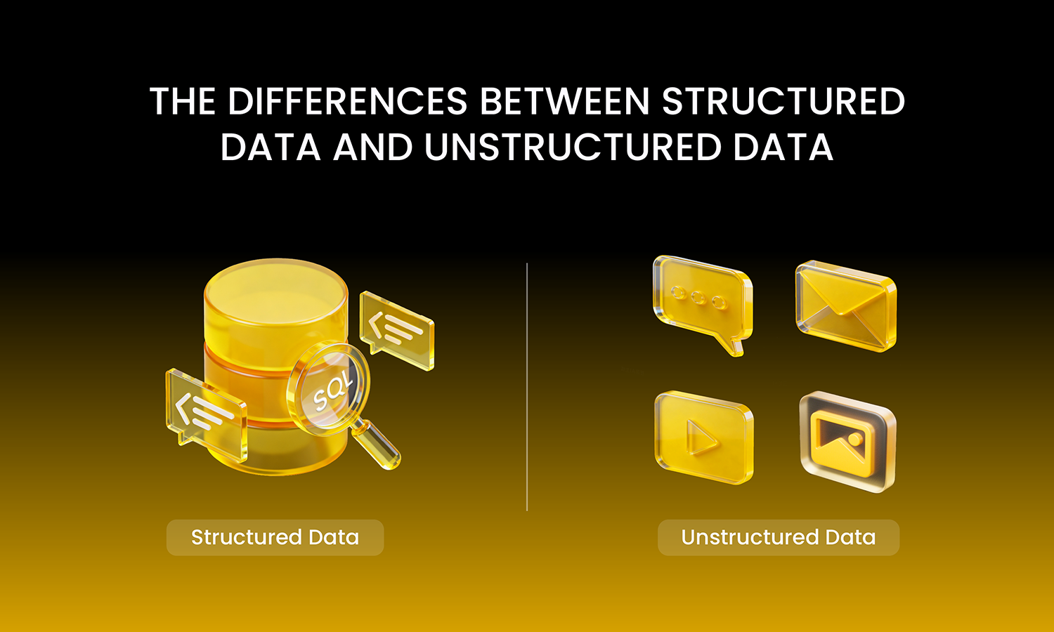 3. Examples | Customer IDs, transaction records, inventory numbers. | Emails, chat logs, PDFs, presentations, images, videos, social media posts. |